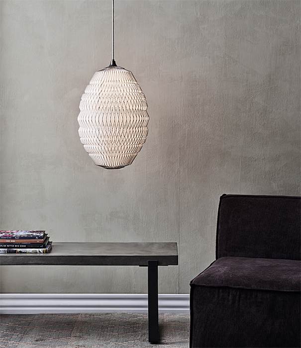 Neue Lampe in der CALEO-Familie. Inspiriert vom CALEO ORIGINAL entstand die gesamte Serie, zu der neben der ursprünglichen Lampe auch eine kleine und mittelgroße kegelförmige Pendelleuchte gehört. Das Muster und die Schnur bleiben in den neuen Lampen erhalten, während die Befestigung und Ausrichtung des Musters bei den beiden anderen Lampen der CALEO-Serie traditioneller ist.