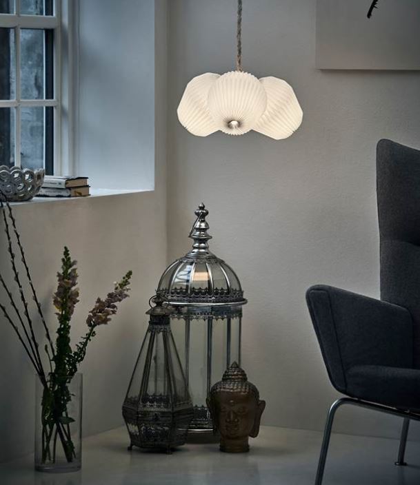 Die Form wird von den Le Klint-Mitarbeiterinnen in Odense per Hand gefaltet und mit geflochtenen Schnüre aus natürlichem rustikalem Leinenstoff bezogen. Dank der Flechtungen können die Schirme nach Belieben arrangiert werden, um genau das Bouquet zu erschaffen, das man sich zu Hause wünscht. Ein weiteres kleines Detail der Lampe ist der Schirmhalter aus Eiche.