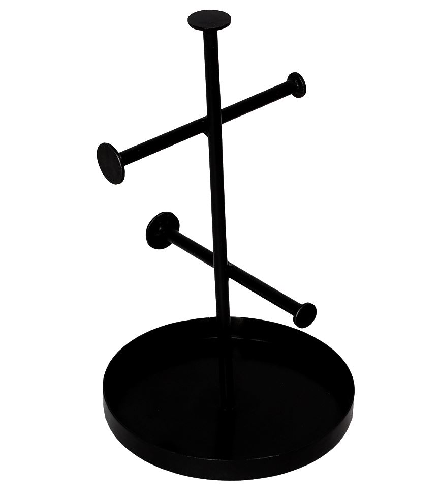 Schöner, kleiner Schmuckhalter aus schwarzem Eisen zum Aufbewahren von Halsketten, Armbändern und Ohrringen. Der Ständer hat einen runden Fuß, der wie ein kleines Tablett geformt ist, um kleine Schmuckstücke aufzubewahren. Das schlichte Design harmonisiert wunderbar mit vielen anderen Dekorationsartikeln.