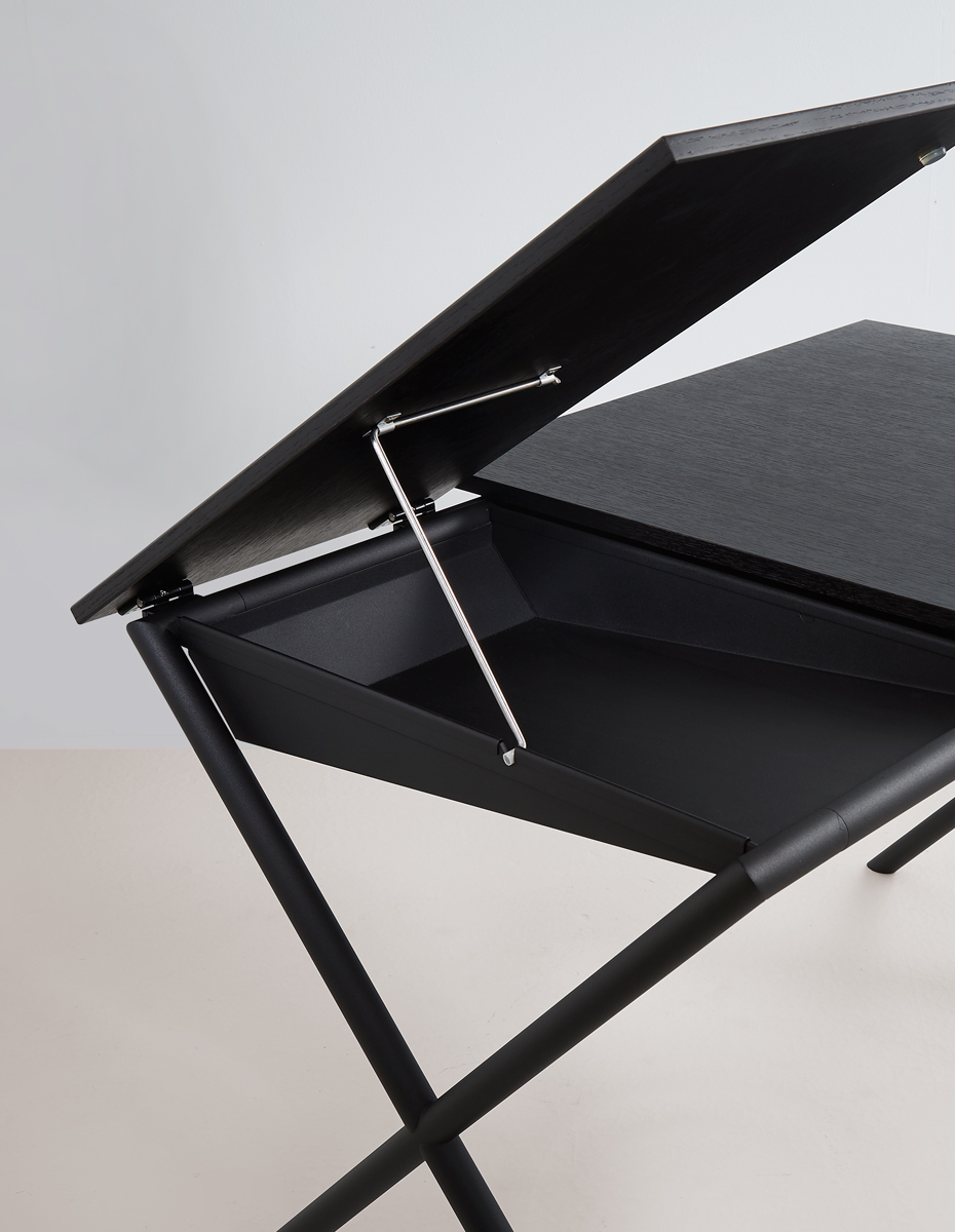 Grosse Klappe Ein Sekretär oder kleiner Esstisch mit überraschenden Eigenschaften. Die 1/3 zu 2/3 geteilte Tischplatte kann hochgeklappt werden. Darunter befinden sich drei Ablagefächer. Diese sind formal so gestaltet, dass sie in geschlossenem Zustand kaum wahrgenommen werden und den Tisch leicht und elegant aussehen lassen. SEQ erinnert an alte Schulpulte – auf dem Tisch liegt nur das, womit man sich gerade beschäftigt, alles andere ist ordentlich in den darunterliegenden Behältern verstaut.