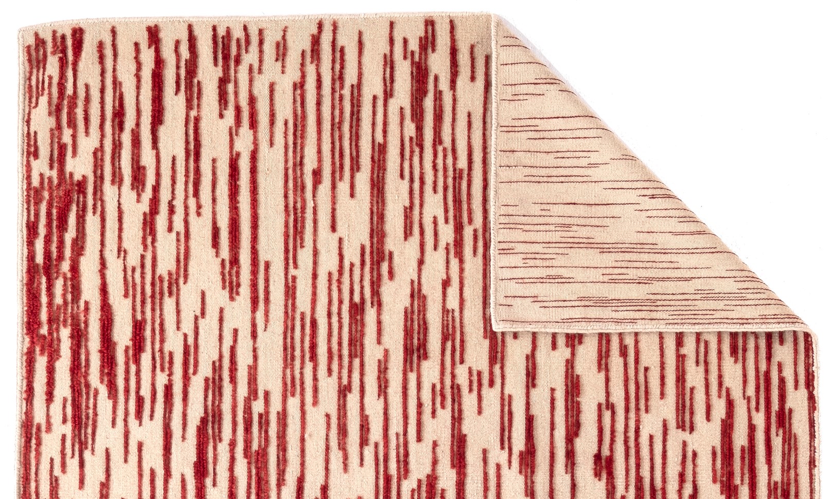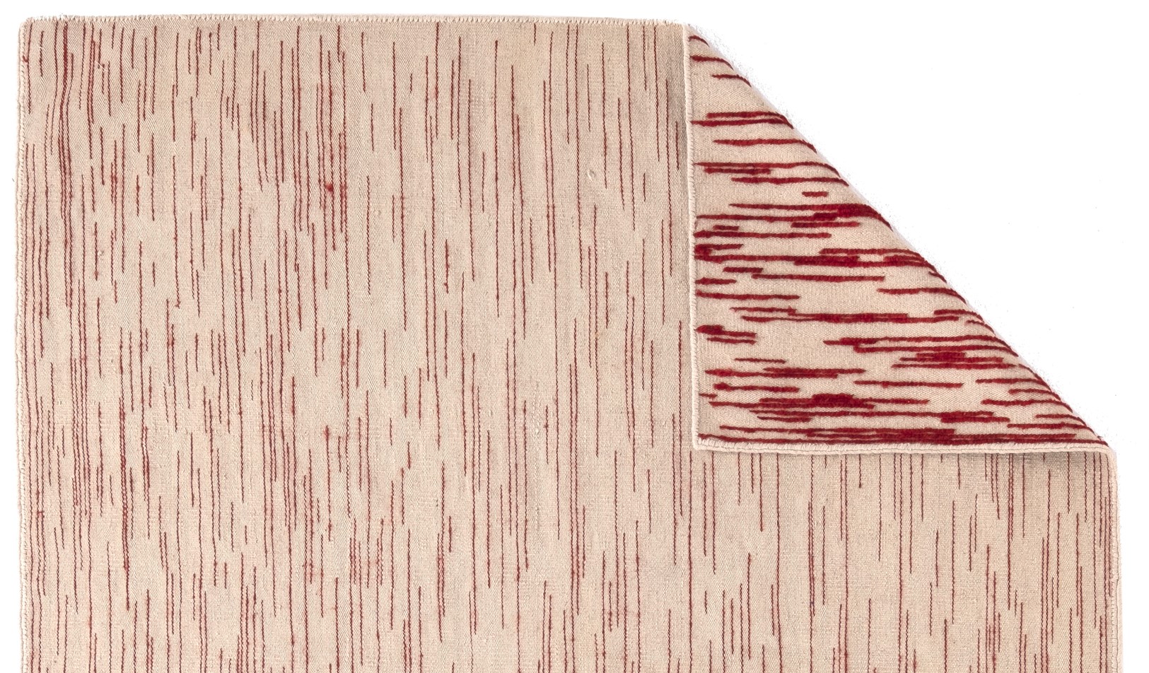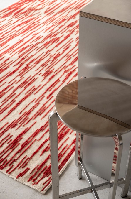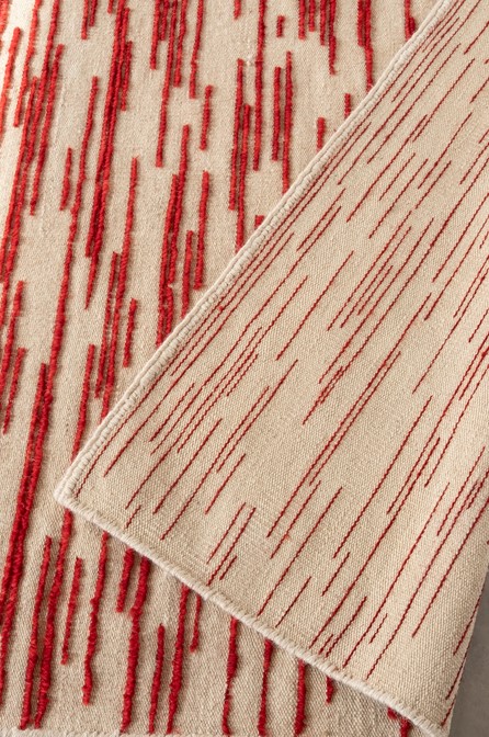 Doblecara, entworfen von Ronan Bouroullec, spiegelt seinen Geist der Geometrie durch subtile lineare und unterbrochene Striche wider, die in einem verschwommenen Punkt enden und im Auge des Betrachters ein Gefühl der Bewegung erzeugen.Doblecara 3 ist ein Wendeteppich, der von beiden Seiten genossen werden kann. Die "A"-Seite zeigt das Design mit der größten Persönlichkeit, bei dem die strengen rotem Linien dank der verschiedenen Ebenen zwischen den Techniken am besten zur Geltung kommen, während die "B"-Seite die subtilste und zarteste ist, bei der der raue Ton zusammen mit den weichen Strichen hervorsticht.