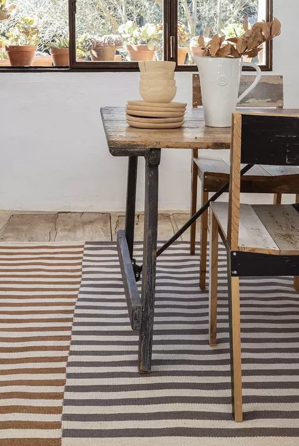Farben, die zu uns sprechen und Gelassenheit vermitteln; freundliche Farben, die aus der Natur kommen und nicht schrill sein wollen. Die von Nani Marquina entworfene Kollektion Ceras ist das Ergebnis eines umfassenden Studiums der Farbe durch den manuellen Prozess des Nachzeichnens mit Buntstiften.Ein intuitiver und instinktiver Prozess, eine Suche nach dem Gleichgewicht unter Verwendung von drei Farben und etwas so Einfachem wie dem Zeichnen von Streifen in Wiederholung. Ein einfacher, auf die Sinne abzielender Code, der sich mit sich selbst, mit den Objekten um uns herum und sogar mit den Menschen verbindet.