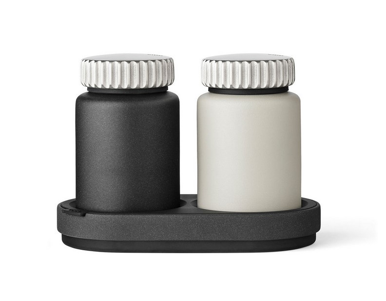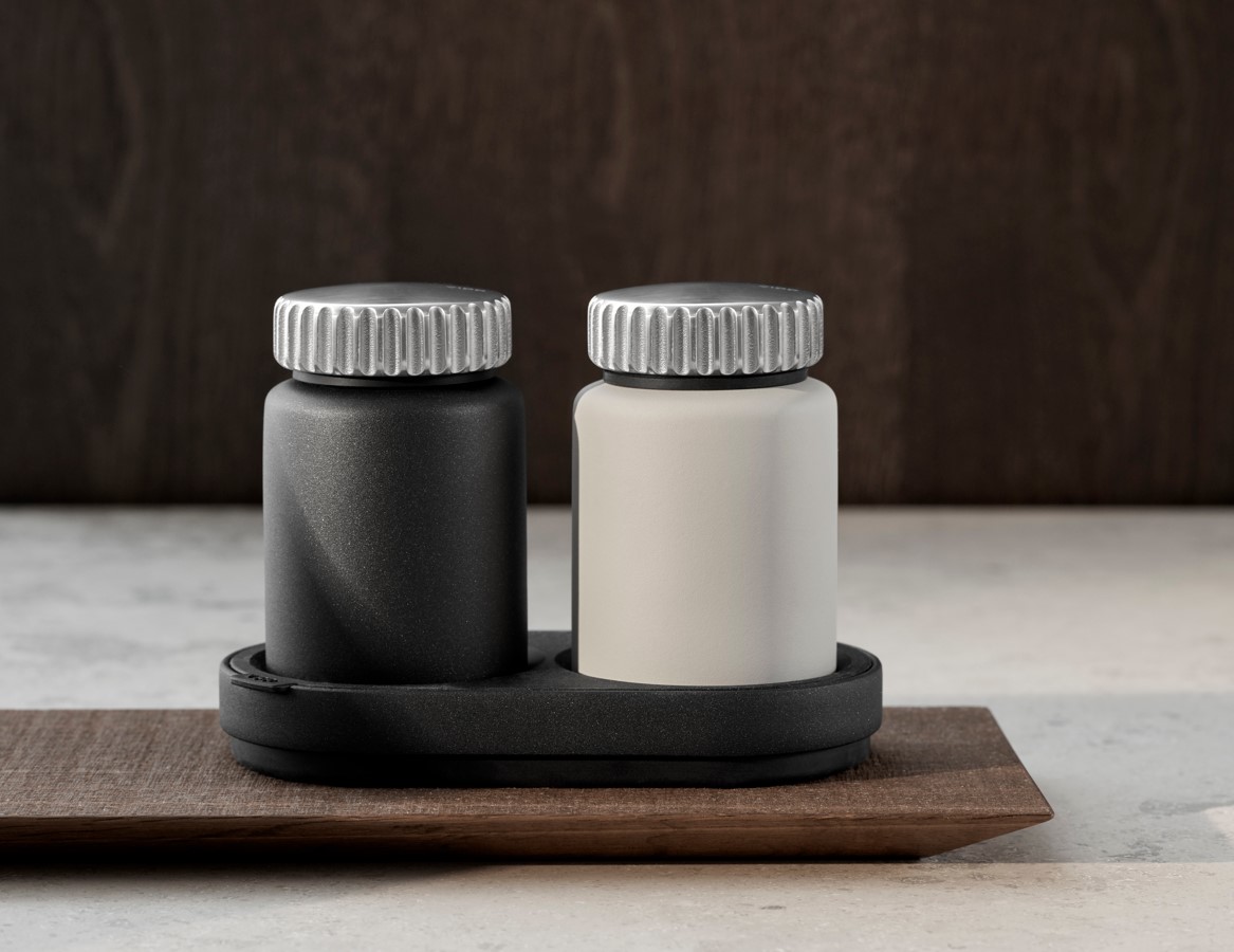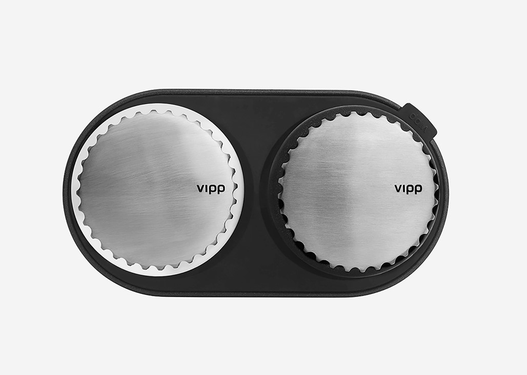 Die Vipp Salz- und Pfeffermühlen gehören auf jeden Küchen- oder Esstisch. Die Mühlen haben jeweils einen Drehkopf und ein strapazierfähiges Keramikmahlwerk, das ein raffiniertes Mahlgeräusch erzeugt. Der gemeinsame Untersetzer hat einen herausnehmbaren Einsatz.