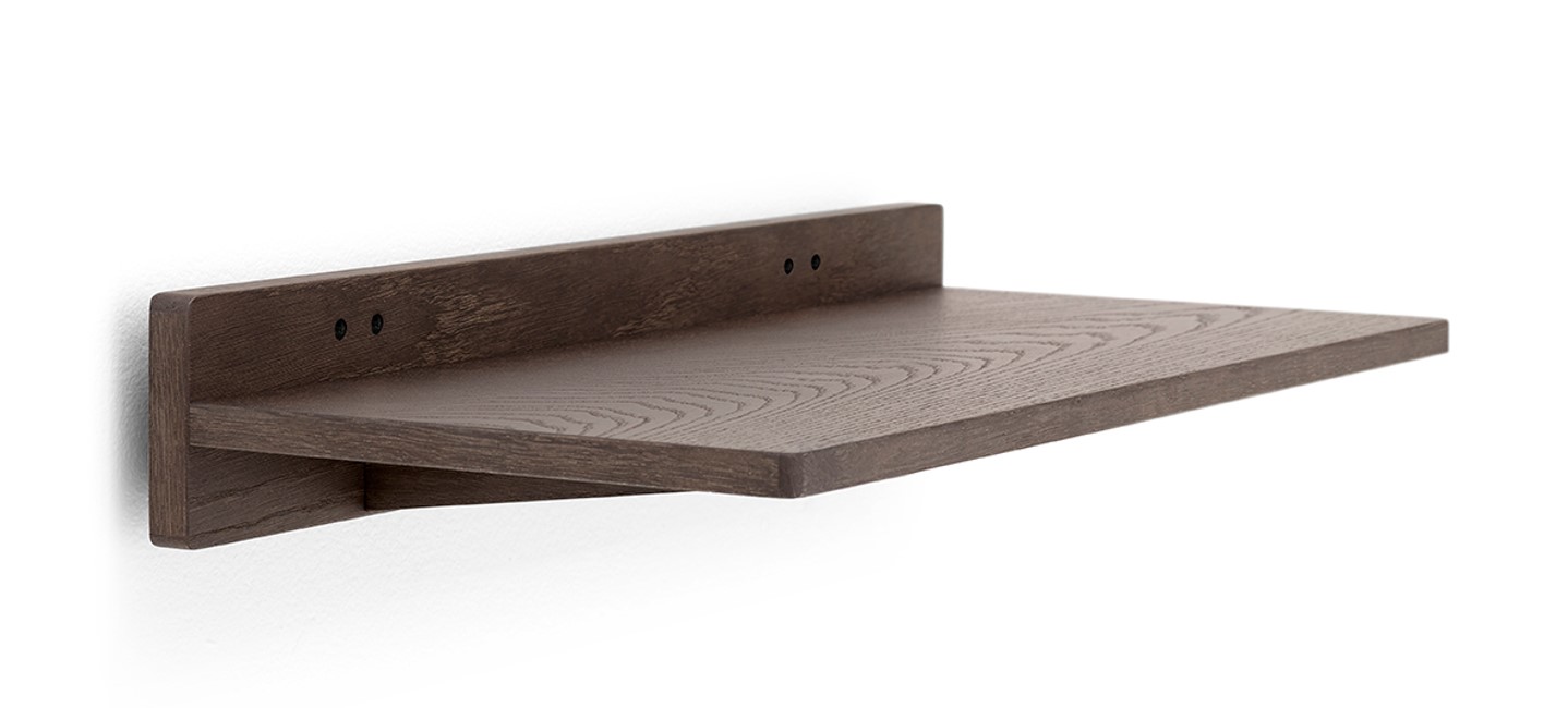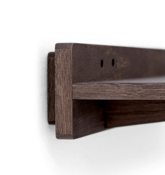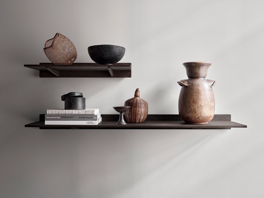 Mit diesem Regal-Duo aus dunklem Eichenholz setzt Vipp seinen Ausflug in den Wald fort. Die beiden Regale sind in einer Länge von 60 bzw. 120 cm und in der jeweils gleichen Tiefe erhältlich und können ganz individuell miteinander kombiniert werden. Die Regalplatte ist auf einer schmalen, vertikalen Eichenplatte montiert und wird von zwei nahezu unsichtbaren Regalhaltern getragen.